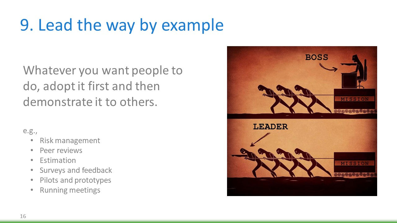 This presentation is a summary of 10 Leadership Practices that the author has observed in his best clients over 30 years. They include: Deadlines, Communication, Skills, Risk, Lessons-learned, and Leading by example.