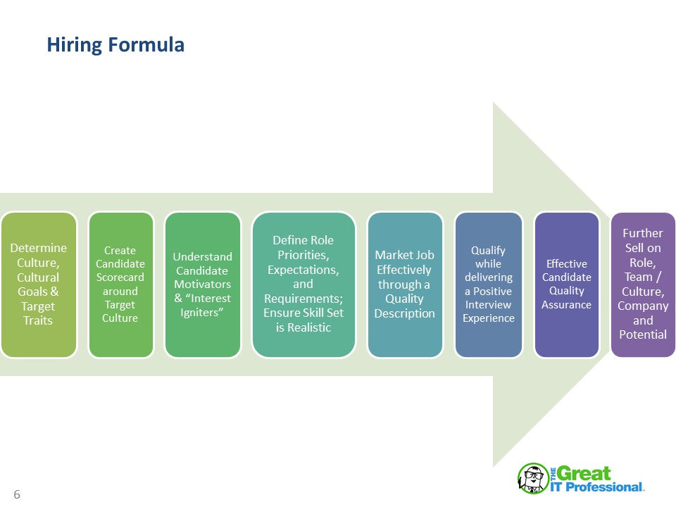 In this session, we outline a formula for a quality hiring process. We cover cultural assessments, job descriptions, and seven tips for enhancing the interview process.