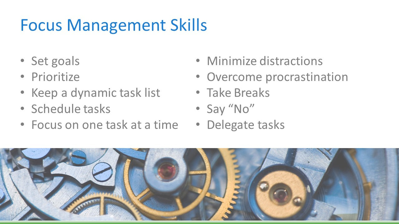 In this webinar, learn how to manage your time, energy, and priorities in today’s distracted world to make sure you are working on the right things to meet deadlines and accomplish your goals.