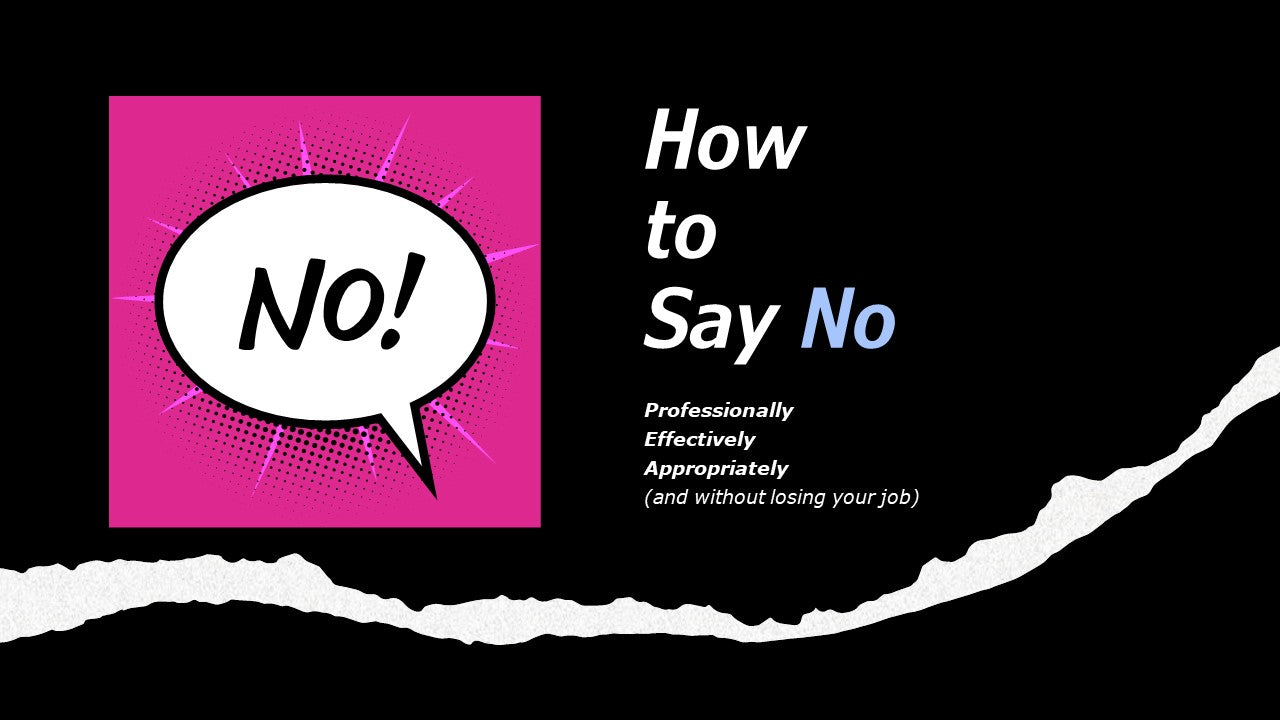 In this webinar, you’ll learn when to say no to work-related requests, how to refuse (even when it’s your boss or customer), and how to deal with pushback or negative responses.