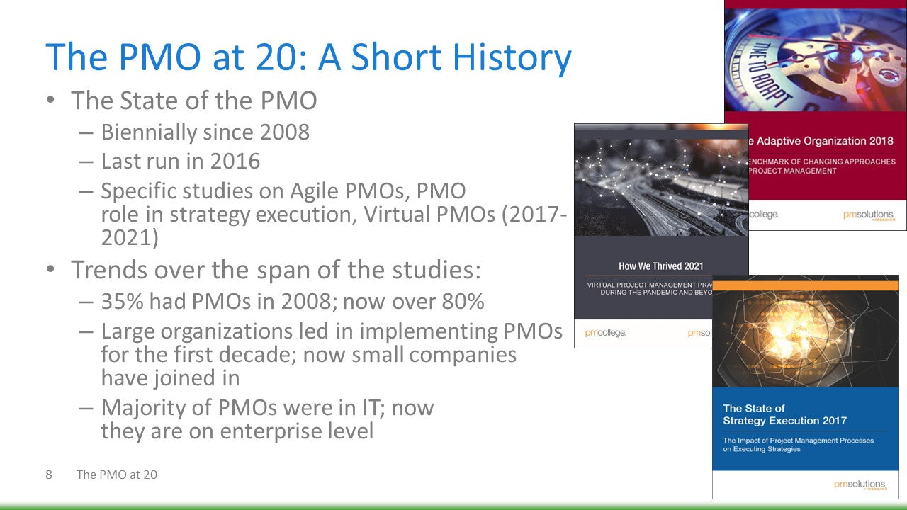This webinar will present the results of the latest “State of the PMO” study which delves into new areas such as PM as a Managed Service, the impact of virtual project management strategies implemented in 2020, and the expanded strategic role of PMOs at the enterprise level.
